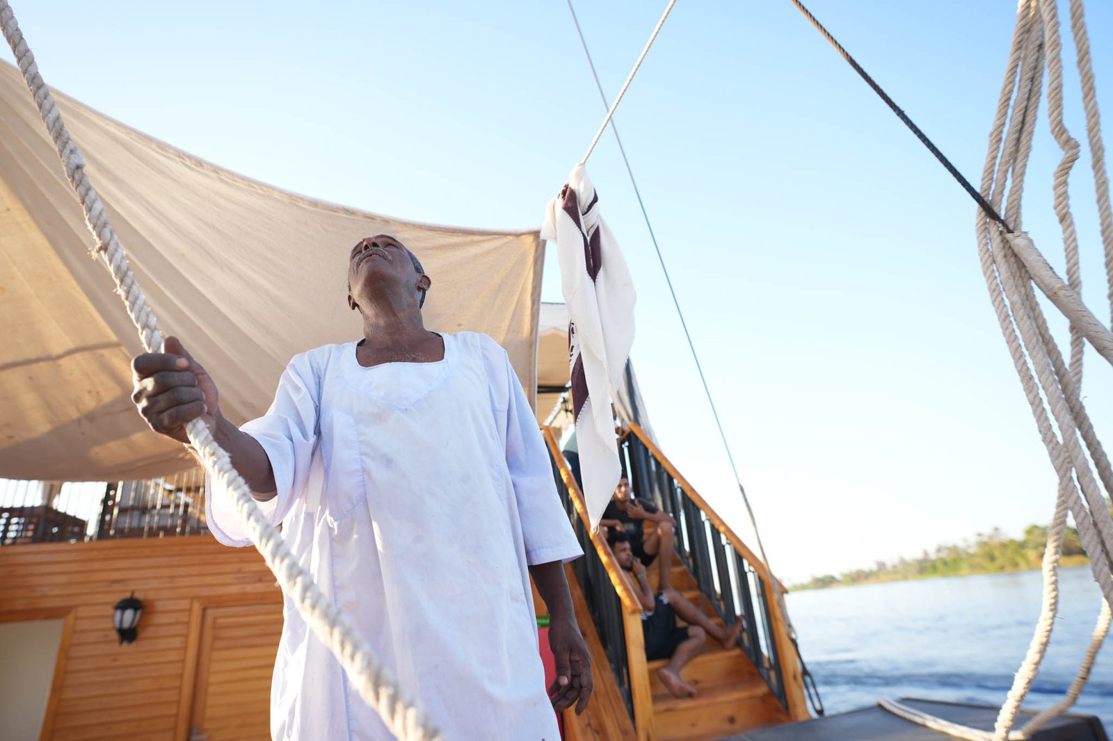 You will be welcomed by the crew, given a tour of the boat, and then set off as the dahabiya departs the shore—your journey on the Nile begins.